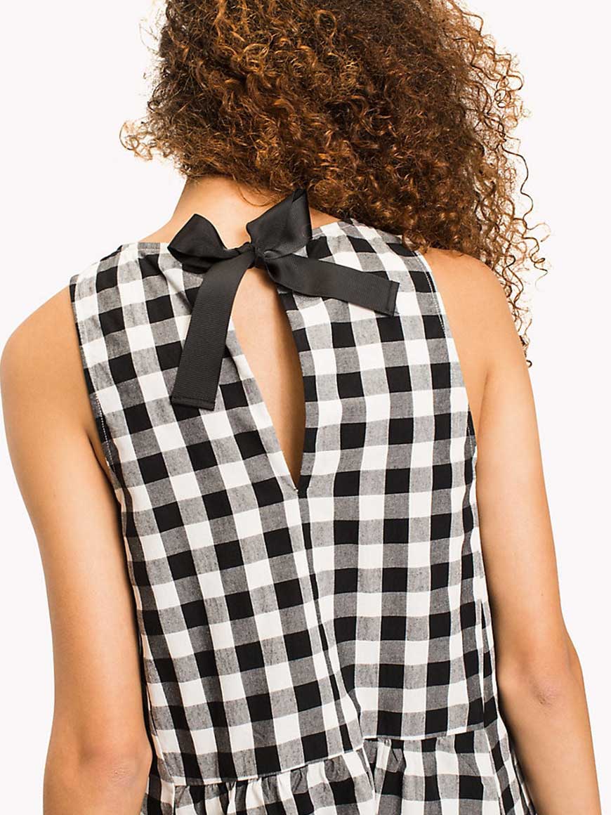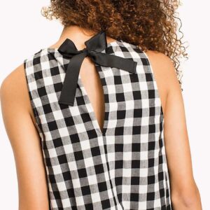 فستان صيفي قصير بدون أكمام بتصميم مريح وعصري، يتميز بنقشة مربعات “جينغهام” كلاسيكية باللونين الأبيض والأسود. مثالي للإطلالات اليومية الكاجوال في الأجواء الحارة.